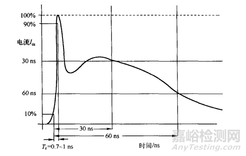 上升沿的長(zhǎng)度取決于放電路徑的電感? 下圖所示的放電電流波形是人體放電時(shí)產(chǎn)生的波形: