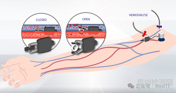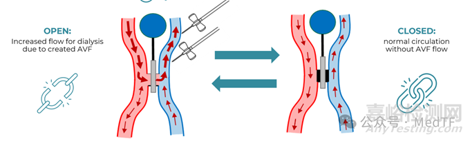 Dynamic AVF允許患者僅在透析期間打開動靜脈內(nèi)瘺,讓動脈血直接回流到靜脈。在非透析期間則關(guān)閉動靜脈內(nèi)瘺,讓動脈和靜脈恢復(fù)正常血液循環(huán)。