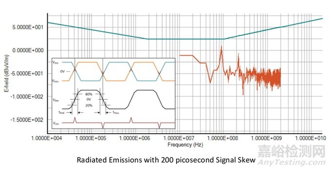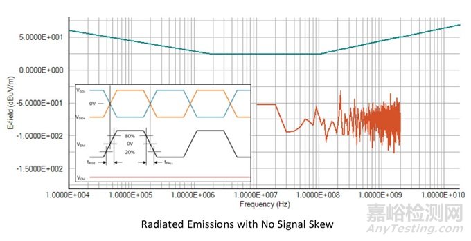 信號完整性差會從電路走線和信號線產(chǎn)生更大的輻射。以下示例說明了SI影響EMC的一種方式。這個示例對比了兩個平衡差分LVDS信號產(chǎn)生的電纜輻射。首先,LVDS信號的偏移為零,然后將它的偏移改為200ps。