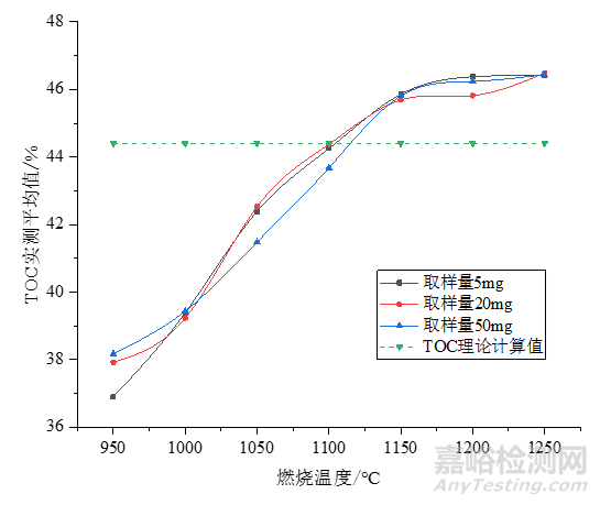 ▲ 不同燃燒溫度、不同取樣量時(shí),TOC的實(shí)測(cè)結(jié)果平均值