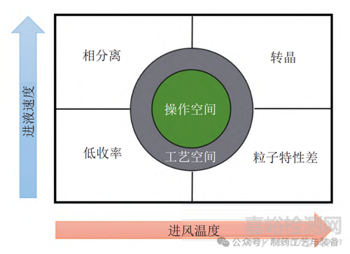 噴霧干燥法的整個(gè)工藝過程分為 4 個(gè)步驟:液體的霧化、液滴與干燥氣體的接觸、溶劑揮發(fā),以及干粉與氣體的分離。每個(gè)步驟的工藝參數(shù),如溶液濃度、進(jìn)液速度、霧化壓力、進(jìn)風(fēng)溫度和抽風(fēng)風(fēng)量等都對ASD中間體的質(zhì)量或收率等有影響[25-26]。例如:溶液濃度較低時(shí),黏度較低,噴霧時(shí)形成的液滴也較小,所得的噴干粉末往往圓且細(xì);而濃度較高的溶液會導(dǎo)致噴干顆粒具有中空的結(jié)構(gòu)、粗糙的表面以及較高的孔隙率和密度,所得顆粒較粗且易于分離,從而提高收率。溶液濃度相同時(shí),在較高的霧化壓力下可得到較細(xì)的液滴,從而得到較細(xì)的干燥粉末。較快的進(jìn)液速度會降低出風(fēng)溫度,使所得顆粒的粒徑變大,導(dǎo)致比表面積減小、溶出度降低,同時(shí)溶劑殘留量可能增加。較高的進(jìn)風(fēng)溫度可使出風(fēng)溫度隨之增加,殘留溶劑量變少,并增加產(chǎn)品收率。較高的抽風(fēng)風(fēng)量會降低溶劑殘留量,增強(qiáng)旋風(fēng)分離效果,同時(shí)也可能增加出風(fēng)溫度。上述影響因素中,進(jìn)風(fēng)溫度和進(jìn)液速度是較重要的 2 個(gè)工藝參數(shù),對 ASD 的性質(zhì)有顯著影響[10],如圖1 所示。