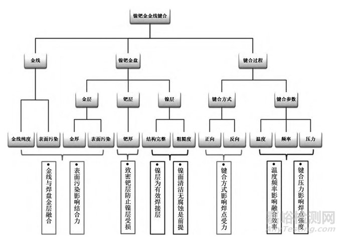 為了更清晰地理解影響金線引線鍵合可靠性的因素,需要對(duì)化學(xué)鎳鈀金金線引線鍵合的影響因素進(jìn)行樹狀圖分析,深入分析各因子的作用及關(guān)鍵控制點(diǎn)。