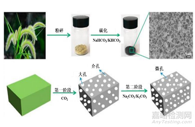 然而,僅采用KHCO3做造孔劑需要高的活化溫度。為解決這一問題,Liang等人嘗試以NaHCO3/KHCO3為活化劑,在600℃的活化溫度下用狗尾草籽制備出氮、硫共摻雜多孔碳(NSPC),合成方法如圖1所示。該多孔碳具有連續(xù)的3D互聯(lián)蜂狀結(jié)構(gòu),并且所得大孔孔徑可達1 μm。豐富的孔道聯(lián)結(jié)以及大孔孔徑明顯增強了電化學性能,所得材料可以更好地應用于電化學領域。KHCO3與NaHCO3的共同協(xié)同作用,不僅可以降低碳化的溫度,而且可以得到孔徑更大的3D分級多孔碳。