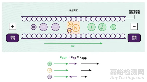 Figure 1 毛細(xì)管電泳儀的分離原理(化學(xué)物質(zhì)在毛細(xì)管電泳中的分離取決于電泳遷移率和電滲遷移率的共同作用)(來(lái)源:https://zhuanlan.zhihu.com/p/666575092)