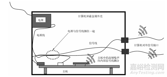 受到電源上的噪聲和主板高頻噪聲 “污染” 的USB? 耳機(jī)? 麥克風(fēng)線在EMC測(cè)試時(shí)繼 續(xù)引向機(jī)箱的屏蔽體外, 最終導(dǎo)致輻射發(fā)射超標(biāo)。