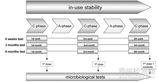 鼻用制劑通常含有一定量的防腐劑,然而,大多數(shù)防腐劑會(huì)產(chǎn)生不良的副作用,影響鼻子的清除和防御機(jī)制,如抑制纖毛運(yùn)動(dòng),為避免使用防腐劑,研究人員設(shè)計(jì)了多種多劑量裝置,3K體系是其中一種。文獻(xiàn)6考察了3K體系中鼻用制劑的使用中穩(wěn)定性。通過(guò)將噴嘴反復(fù)浸入含細(xì)菌的懸浮液中,同時(shí)從系統(tǒng)中排出劑量來(lái)模擬噴嘴區(qū)域周?chē)臐撛谖廴尽C刻熘貜?fù)模擬兩次,持續(xù)4天,結(jié)束3天后測(cè)試第一劑。然后在最后一個(gè)測(cè)試期結(jié)束時(shí),對(duì)第一劑進(jìn)行測(cè)試(如圖1)。結(jié)果表明開(kāi)啟后可使用6個(gè)月。