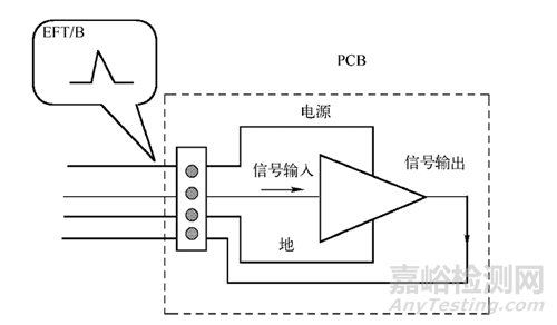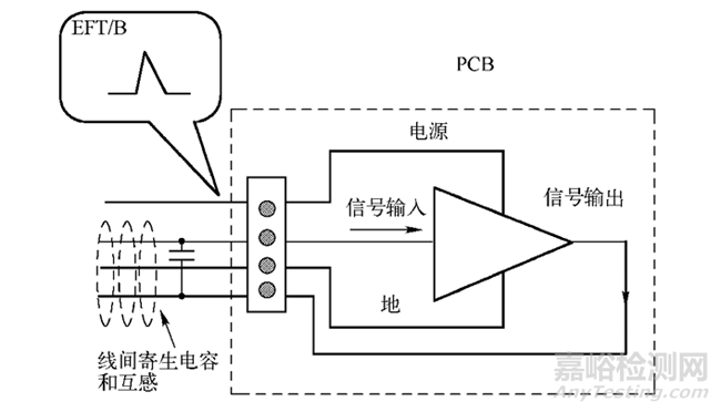 EFT/B 測(cè)試時(shí), 由于EFT/B信號(hào)的高頻成分較多, 干擾能量會(huì)通過導(dǎo)線之間的互感和線間寄生電容耦合到放大器的輸入端?