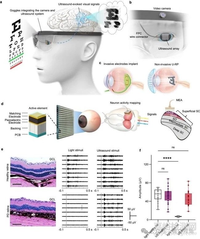 南加州大學(xué)維特比分校研究團(tuán)隊(duì)引入了基于超聲的視網(wǎng)膜假體(U-RP),其創(chuàng)新思路是通過攝像頭捕捉外部環(huán)境圖像,傳至處理和控制單元轉(zhuǎn)化為超聲控制信號引導(dǎo)超聲陣列,專門的二維超聲陣列產(chǎn)生超聲波精確刺激視網(wǎng)膜,受刺激的視網(wǎng)膜神經(jīng)元產(chǎn)生視覺信號經(jīng)視神經(jīng)傳遞到大腦產(chǎn)生人工視覺。