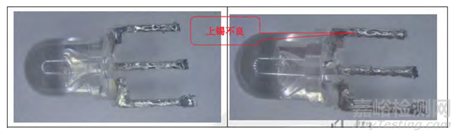 通過對不上錫二極管失效樣品的收集和分析,我們發(fā)現(xiàn)異常樣品及失效批次產(chǎn)品在浸錫后均出現(xiàn)了上錫不良的現(xiàn)象。這些現(xiàn)象主要表現(xiàn)為局部退濕潤,引腳表面存在許多空洞,以及上錫不飽滿等異常情況。