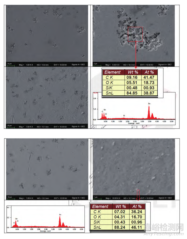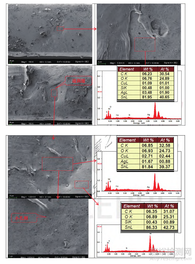 2. 浸錫不良的樣品上,上錫不良區(qū)域的空洞更大、更明顯。部分退濕潤區(qū)域僅檢測到C、O、Si、Sn,未檢測到Ag和Cu元素,且形貌存在差異。