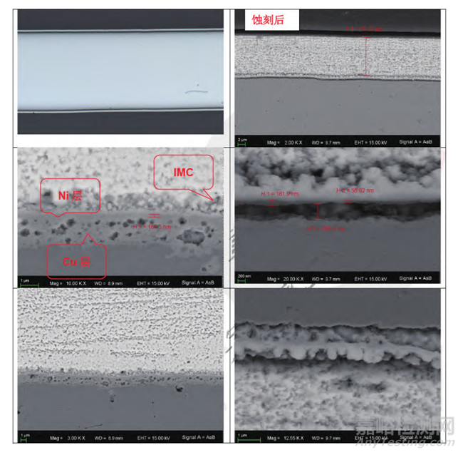 對二極管未浸錫引腳進(jìn)行切片、蝕刻Sn和Cu后,對截面進(jìn)行SEM觀察,發(fā)現(xiàn)Sn鍍層和Ni鍍層之間形成了一層連續(xù)的IMC(金屬間化合物),Cu層未見缺失現(xiàn)象,Sn鍍層厚度約為10μm。進(jìn)一步的離子束拋光處理后觀察發(fā)現(xiàn),Sn鍍層表面和內(nèi)部存在較多大小不一的空洞,部分空洞中可見明顯的有機(jī)物殘留。