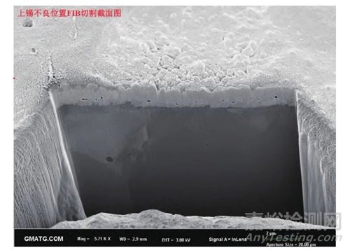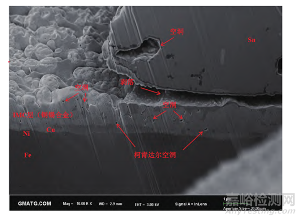 通過對上錫不良位置進(jìn)行FIB(聚焦離子束)切割,結(jié)果顯示燈腳支架為鐵基材,基材上依次為鎳、銅,在鍍銅層表面支架鍍錫。在高溫浸錫過程中,焊料中的錫與鍍銅層中的銅形成銅錫合金化合物。截面觀察發(fā)現(xiàn),在IMC層(銅錫合金層)可觀察到空洞,玻璃位置位于IMC層與錫層之間,同時發(fā)現(xiàn)鍍銅層與IMC層界面形成了空洞,即柯肯達(dá)爾空洞。