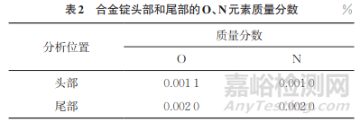 為了嚴格控制合金熔煉后的O、N元素含量,減少合金錠頭尾部的偏析,采用的熔煉工藝為真空感應熔煉+ 電渣重熔+ 真空自耗的三聯(lián)工藝。鍛后棒材的化學成分分析結果如表1所示,其化學成分符合SAE AMS 5660《鎳鐵合金,耐腐蝕和耐熱,棒材和鍛件12.5Cr-42.5Ni-6.0Mo-2.7Ti-0.015B-34Fe自耗電極重熔或真空感應熔化、穩(wěn)定和沉淀熱處理》的要求。合金錠頭部和尾部的O、N元素質(zhì)量分數(shù)如表2所示。在鍛后合金的中間段取樣,并對試樣進行短時高溫持久和長期高溫持久試驗。