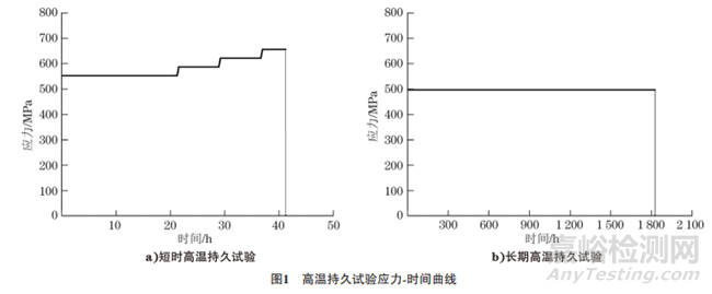 依據(jù)ASTM E292-18 《材料缺口拉伸試驗斷裂時間的標準試驗方法》,利用高溫持久試驗機進行試驗。為了滿足大型汽輪機對于該材料的使用工況需求,選取溫度為649℃,應力為552MPa和溫度為621℃,應力為496MPa兩個條件進行試驗,其中短時高溫持久試驗保持試驗溫度不變,在達到試驗時間23h后,每隔8h提升34.5MPa應力,直至試樣斷裂;長期高溫持久試驗保持應力與溫度不變,直至試樣斷裂。試驗的應力-時間曲線如圖1所示。