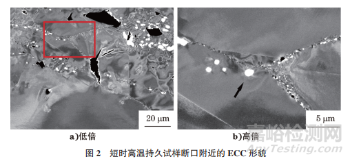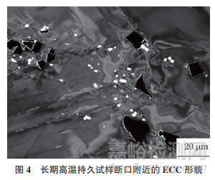 短時高溫持久試驗最終斷裂時間為43.6h,斷裂位置為試樣光滑段處。短時高溫持久試樣斷口附近的ECC形貌如圖2 所示。由圖2可知:在高溫持久試驗過程中,試樣形成的微裂紋沿晶界分布,并且在晶界裂紋處形成大量孔洞;在晶界附近觀察到大量呈鏈狀分布的白色塊狀物。