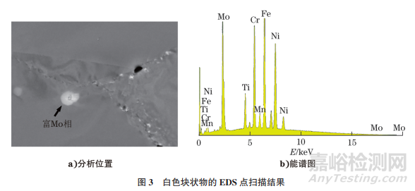 對該塊狀物進行EDS點掃描分析,結果表明該白色塊狀物為富Mo相(見圖3)。