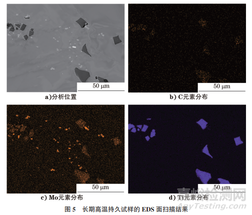 對試樣進行EDS面掃描分析,結果如圖5所示。由圖5可知:深色塊狀物中含有Ti、Mo元素,并含有少量C元素,而白色塊狀物僅富集Mo元素,該結果與短時高溫持久試樣中白色塊狀物的EDS點掃描結果吻合。
