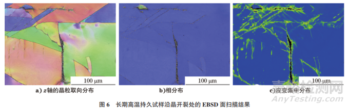 在長期高溫持久試樣的沿晶開裂處取樣,對其進行EBSD面掃描分析,結果如圖6所示。由圖6可知:在試樣中觀察到少量大尺寸塊狀(Mo,Ti)C 顆粒沿晶界分布,并且在晶界裂紋處發(fā)現(xiàn)大量析出的鏈狀細小顆粒,該顆粒為彌散分布的(Mo,Ti)C 相;晶界處大尺寸顆粒與小型碳化物富集導致應變集中,其分布也與沿晶開裂的分布一致。