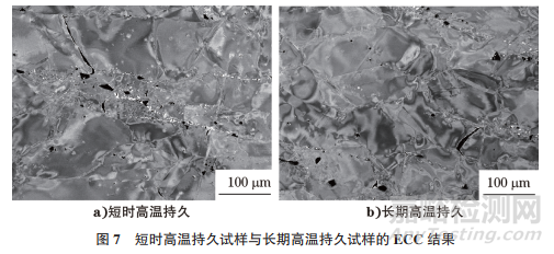 短時高溫持久試樣與長期高溫持久試樣的ECC結果如圖7所示。由圖7可知:短期高溫持久試樣與長期高溫持久試樣的ECC形貌相似,晶界處產(chǎn)生了明顯的沿晶開裂,沿晶開裂附近分布有大量孔洞,且部分孔洞沿白色鏈狀富Mo相方向集中分布,在晶界內(nèi)可見少量微小孔洞。