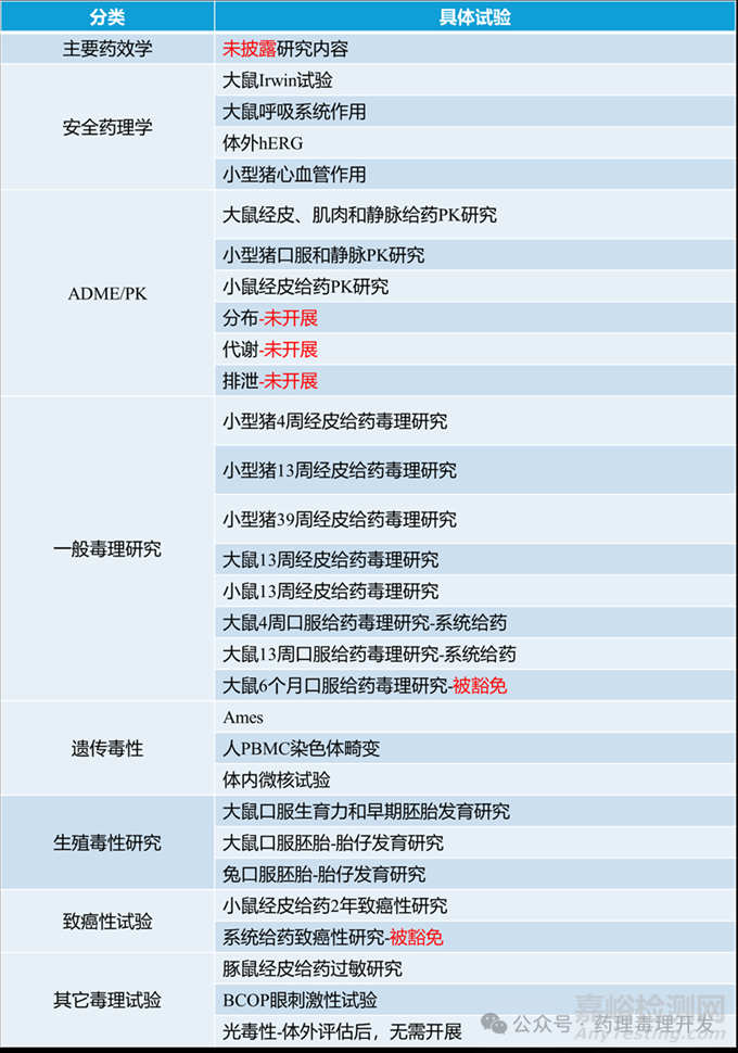 Zelsuvmi的非臨床研究package如下表所示。正常的地方就不啰嗦了,解釋下異常的地方吧。主要藥效學(xué)沒有披露具體研究內(nèi)容,本身作用機制確實就不太清楚,另外可能沒有合適的動物模型。也可能開展了一些試驗,F(xiàn)DA沒有總結(jié)進來。大概率是前者。藥代方面未開展分布、代謝和排泄,可能與藥物活性成分是一氧化氮有關(guān)。不過,未開展非嚙齒類動物的PK研究,不曉得原因是什么,用TK數(shù)據(jù)支持嗎?一般毒理開展了嚙齒(經(jīng)皮+口服)和非嚙齒類(經(jīng)皮)短期重復(fù)給藥毒理試驗,未開展非嚙齒類系統(tǒng)給藥途徑的毒理研究。更長周期經(jīng)皮給藥重復(fù)給藥毒理研究僅在小型豬中開展,可能與短期經(jīng)皮給藥毒理結(jié)果嚙齒類和小型豬比較相似或者小型豬皮膚與人體更為接近有關(guān)。更長周期系統(tǒng)給藥途徑毒理研究因經(jīng)皮給藥系統(tǒng)暴露量很低被豁免。系統(tǒng)給藥的致癌性研究以同樣的理由豁免。