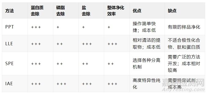 目前已開發(fā)出多種樣品提取策略。對于小分子分析物,蛋白質(zhì)沉淀(PPT)、液液萃?。↙LE)和固相萃取(SPE)是最常用的樣品制備方法。對于多肽和蛋白質(zhì)分析物,SPE、PPT 和免疫親和萃?。↖AE)被廣泛使用。下表總結(jié)了這些樣品制備策略的優(yōu)勢和局限性,接下來將詳細(xì)介紹。