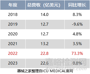財報數據顯示,2018年-2021年ICU Medical的平均營收在13億美元每年,但自2022年收購后,增幅達到了73%,完成營收22.8億美元。其中,Smiths Medical的產品貢獻了9.5億美元。