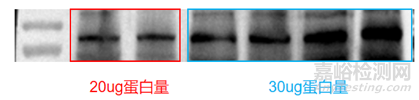 上樣量對(duì)背景也有影響。如果預(yù)實(shí)驗(yàn)發(fā)現(xiàn)蛋白濃度較低,那么下次提取時(shí)就需要適當(dāng)提高組織或細(xì)胞用量,而不可一味地加大上樣量,如下圖所示,加大上樣量時(shí),背景也會(huì)隨之加深。