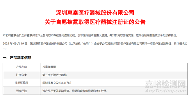 近日,深圳惠泰醫(yī)療器械股份有限公司(以下簡稱“惠泰醫(yī)療”) 全資子公司湖南埃普特醫(yī)療器械有限公司(以下簡稱“埃普特醫(yī)療”)的栓塞彈簧圈獲得第三類醫(yī)療器械注冊證,該產(chǎn)品用于外周動脈瘤、動靜脈畸形和動靜脈瘺的栓塞。此次注冊證的取得,豐富了公司的產(chǎn)品種類,擴(kuò)充了公司在外周領(lǐng)域產(chǎn)品布局。