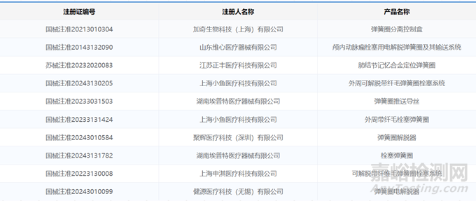 部分已獲批的進(jìn)口彈簧圈類產(chǎn)品
