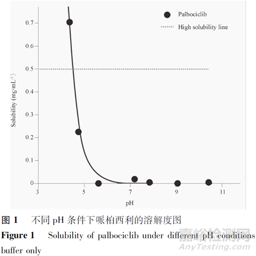 哌柏西利活性成分為游離堿,解離常數(shù)(pKa)為7.4和3.9。哌柏西利在pH值4及以下的強(qiáng)酸性含水介質(zhì)中具有良好的溶解度,pH值高于4后,溶解度隨pH值的增加顯著降低,pH依賴溶解度如圖1所示。