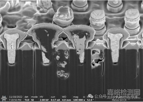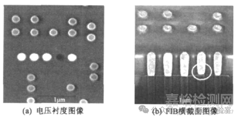 實(shí)際操作時(shí)要將芯片研磨到接觸孔露出來(lái),然后采用低能量的電子發(fā)射到樣品表面(如1kV),然后觀察樣片表面接觸孔的亮度,通過(guò)對(duì)比同一區(qū)域的接觸孔亮度或者與好品進(jìn)行比較,找出異常的接觸孔,判別其失效類型,隨后可用FIB進(jìn)行進(jìn)一步確認(rèn)。