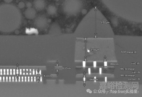 6、芯片去層:以干、濕蝕刻及研磨(Polishing)等方法去除各Metal層做逆向分析,用光學(xué)顯微鏡(50x~1500x)或電子顯微鏡拍攝(更大倍率),檢視是否有Metal Leakage或Burn Out、Metal Short等異常,且可利用電子顯微鏡做VC對(duì)照參考,判斷二次電子產(chǎn)生的亮暗異常。