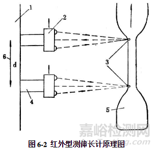 這種伸長(zhǎng)計(jì)是在跟蹤器上采用了紅外線,可以自動(dòng)尋找、探測(cè)和跟蹤加在試樣上的標(biāo)記,這種紅外線測(cè)伸長(zhǎng)計(jì)操作簡(jiǎn)便,適用于生產(chǎn)質(zhì)量控制試驗(yàn),如圖6-2所示。
