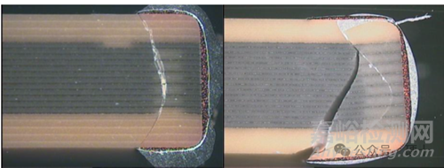 機(jī)械應(yīng)力:MLCC的特點(diǎn)是能夠承受較大的壓應(yīng)力,但陶瓷介質(zhì)層的脆性決定了其抗彎曲能力較差,因此在實(shí)際使用過程中由于PCB變形引起陶瓷體出現(xiàn)裂紋的情況很多。PCB板組裝過程任何可能的彎曲變形操作都可能導(dǎo)致MLCC開裂,常見應(yīng)力源有貼片過程中吸嘴產(chǎn)生的撞擊、單板分割、螺絲安裝等。該類裂紋一般起源于元件上下金屬化端,沿45°角向器件內(nèi)部擴(kuò)展。