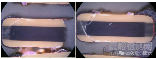 在施加高電壓的情況下,電容內(nèi)部分子會受到極化和應(yīng)力,可能導(dǎo)致絕緣層失效或短路。陶瓷電容也同樣會因?yàn)殡姂?yīng)力過大導(dǎo)致失效,如超規(guī)格使用或MLCC本身耐電壓不足。MLCC的電應(yīng)力失效一般表現(xiàn)為短路。失效為過電應(yīng)力導(dǎo)致電極熔融。