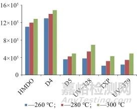 考察進樣口溫度(260、280、300 ℃)對塑料制品中六甲基二硅氧烷(HMDO)、八甲基環(huán)四硅氧烷(D4)、十甲基環(huán)戊硅氧烷(D5)、2-(2H-苯并三唑-2-基)-4,6-二叔戊基苯酚(UV-328)、磷酸三(二甲苯)酯(TXP)、2-(二甲基氨基)-2-[(4-甲基苯基)甲基]-1-[4-(嗎咻-4-基)苯基]丁-1-酮(UV-379) 6種目標物峰面積響應(yīng)值的影響,不同進樣口溫度下目標物的峰面積見圖1。由圖1可知,對于沸點較低的物質(zhì)(HMDO、D4、D5),隨著進樣口溫度升高,峰面積響應(yīng)值略微增大,但影響不明顯;但是對于沸點較高的化合物(UV-328、TXP、UV-379),隨著進樣口溫度升高,峰面積明顯增大,因此選擇進樣口溫度為300 ℃。