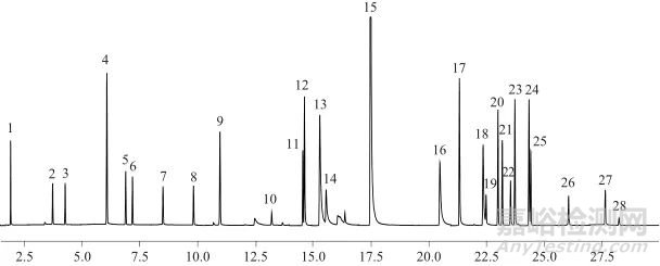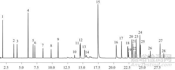 按1.2儀器工作條件測定28種高關(guān)注物質(zhì)混合標準溶液,得到總離子流色譜圖見圖2。由圖2可知,28種高關(guān)注物質(zhì)分離較好,適于定量。28種高關(guān)注物質(zhì)保留時間見表1。