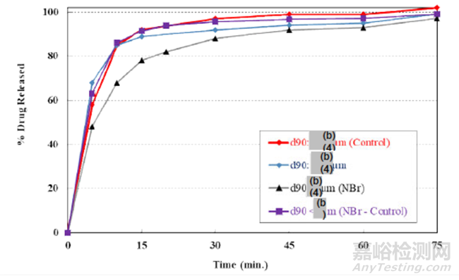 由于參比制劑批次的快速溶出,盡管相似性因子(f2)無法計(jì)算,數(shù)據(jù)仍表明溶出度方法可以顯示不同批次之間的顯著差異,這個差異來源于不同粒度原料藥制得的批次。在測試該粒度原料藥制得的膠囊之前,企業(yè)測試了一個典型原料藥粒度小于XX微米的批次,并將其與D90小于XX微米制得的控制批次相比,結(jié)果表明這兩個批次在溶出曲線上沒有差異。