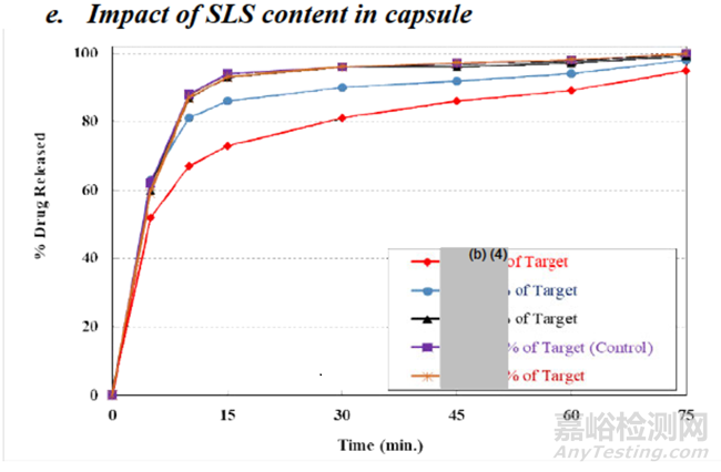 根據(jù)上圖E,擬定的溶出方法能夠區(qū)分非常快速溶也的目標(biāo)(控制)批次和特定比例SLS制備得到的緩慢溶出的批次。