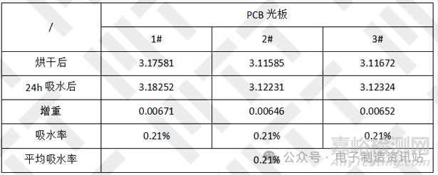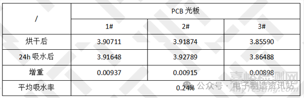 表2.PCB光板吸水率實(shí)驗(yàn)室實(shí)測(cè)結(jié)果(單位:g)