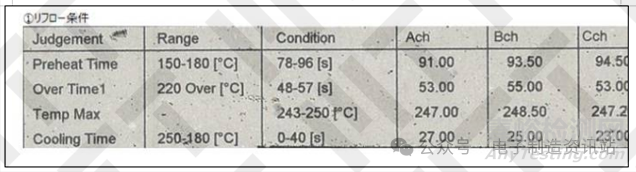 如圖7所示,由profile曲線可知,預(yù)熱時(shí)間(150℃-180℃)最大為94.50s,回流時(shí)間(>220℃)最大為55.00s,峰值溫度最高為248.5℃,參考標(biāo)準(zhǔn)IPC/JEDEC J-STD-020E-2015非氣密固態(tài)表面貼裝器件的潮濕/再流焊敏感度分類中對(duì)回流焊溫度要求,爐溫設(shè)置正常,未表現(xiàn)出熱輸入過(guò)量特征。