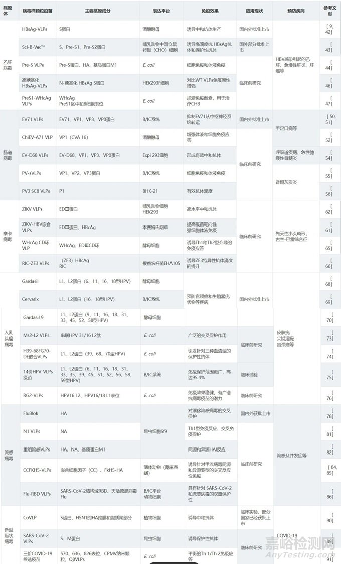 注:HBV為乙型肝炎病毒;HPV為人乳頭瘤病毒;EV為腸道病毒;CPMV為豇豆花葉病毒;WHcAg為土撥鼠肝炎核心抗原;HBcAg 為乙肝病毒核心抗原;HA為血凝素;NA為神經(jīng)氨酸酶