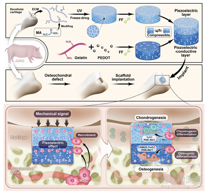 為了解決這一問題,來自北京大學(xué)第三醫(yī)院的張辛與北京化工大學(xué)的蔡晴/喻盈捷團隊合作提出了一種壓電導(dǎo)電支架,由壓電軟骨脫細(xì)胞細(xì)胞外基質(zhì)(dECM)和壓電導(dǎo)電改性明膠(Gel-PC)組成。支架的壓電性是通過在孔表面改性二苯丙氨酸(FF)組件實現(xiàn)的,而支架的導(dǎo)電性是通過加入聚(3,4-乙烯二氧噻吩)實現(xiàn)的。支架上層積聚的正電荷吸引BMSC,促使其向上層遷移并向軟骨分化;同時,下層的負(fù)電荷誘導(dǎo)BMSC向成骨分化(方案1),為有效修復(fù)骨軟骨缺損提供了一個有希望的平臺。