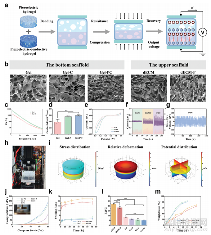 為了驗證雙層支架的電氣性能,利用電化學(xué)工作站獲取支架材料的循環(huán)伏安法 (C-V) 曲線和電化學(xué)阻抗。將PEDOT添加到凝膠中形成導(dǎo)電明膠 (Gel-P) 和壓電導(dǎo)電明膠(GelPC),與未改性凝膠相比,其阻抗更低、離子電導(dǎo)率更高、C-V曲線更大。這表明Gel-P和Gel-PC中的電子傳導(dǎo)和存儲容量有所改善(圖 1c-e)。dECM水凝膠的輸出電壓和電流分別約為3 mV和0.25 μA,而dECM-P水凝膠的輸出電壓和電流分別約為20 mV和0.8 μA(圖1f)。此外,F(xiàn)F肽修飾的雙層水凝膠(DPC)的壓電輸出在1000次循環(huán)中和至少21天內(nèi)保持穩(wěn)定(圖1g、h)。為了模擬雙層支架在體內(nèi)的實際應(yīng)用,從上到下模擬了雙層支架的壓縮。有限元分析結(jié)果表明上部支架材料發(fā)生了較大的變形,應(yīng)力主要集中在上下部支架界面處,與壓縮試驗結(jié)果一致(圖1i、j)。