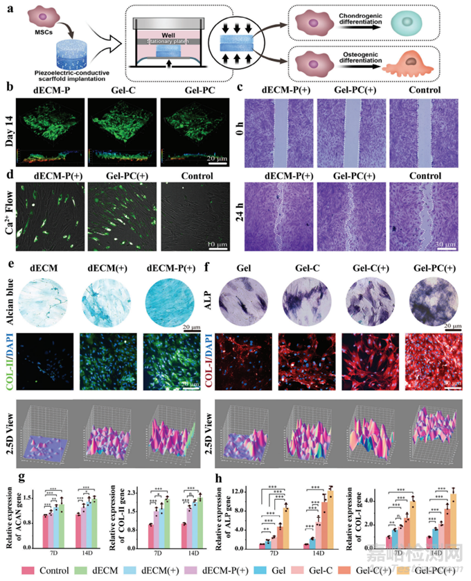 圖2a概述了體外細(xì)胞實驗的過程,其中力電因子刺激細(xì)胞實現(xiàn)差異化成骨/軟骨分化。將支架與細(xì)胞共培養(yǎng)7天和14天以評估dECM-P和Gel-PC水凝膠的生物相容性。細(xì)胞向支架內(nèi)部遷移,形成三維(3D)培養(yǎng)環(huán)境(圖2b)。細(xì)胞遷移實驗表明壓電效應(yīng)顯著促進了細(xì)胞遷移(圖2c)。此外,在壓電刺激下觀察到最強烈的鈣離子內(nèi)流熒光(圖2d),這種影響歸因于壓電刺激打開離子通道,從而促進細(xì)胞遷移。