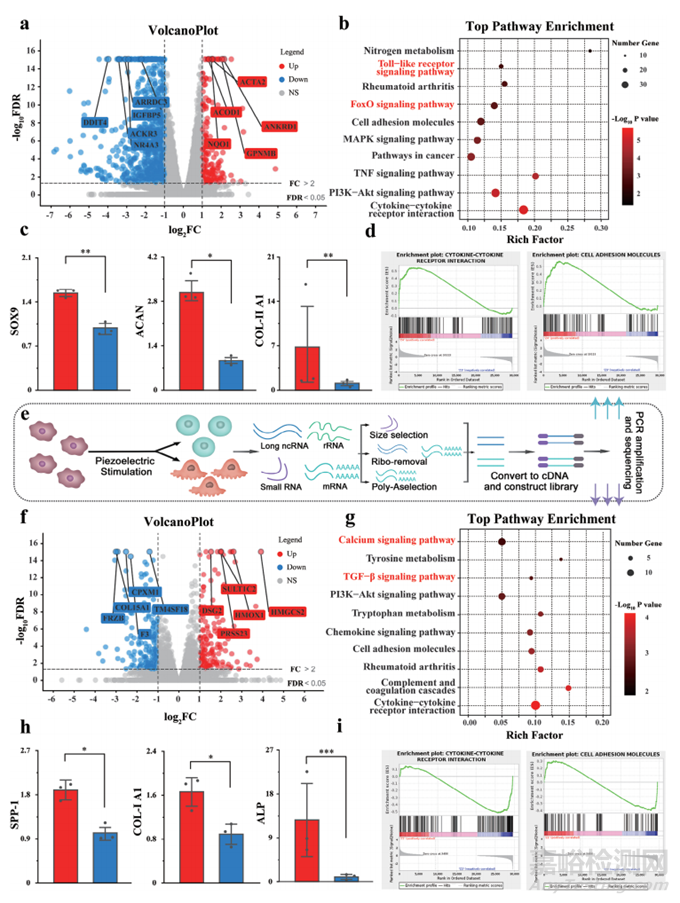 為了研究力電刺激因子在細(xì)胞分化中的作用,作者對上層和下層支架進行了RNA測序。這項分析旨在確定力電通路中影響MSC成骨和軟骨分化的關(guān)鍵靶點和分支點。為此,比較了對照組和壓電刺激組中BMSC的整體基因表達(dá)譜。通路富集結(jié)果表明,Toll樣受體信號通路通過Mg2+調(diào)節(jié)MSCs軟骨形成,這與體外結(jié)果一致。FoxO信號通路是軟骨分化的另一個關(guān)鍵組成部分。這些通路為可能的信號傳輸提供了多種選擇(圖3b)。SOX9、COL-II A1和ACAN的RNA測序結(jié)果為各組之間的分化提供了進一步的證據(jù)(圖3c)?;蚣患治觯℅SEA)結(jié)果如圖3d所示,表明dECM-P(+)組與細(xì)胞因子-細(xì)胞因子受體相互作用和細(xì)胞粘附分子呈正相關(guān)。