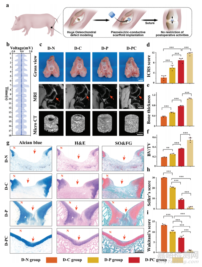 基于以上實驗結(jié)果,作者進行了體內(nèi)實驗以驗證壓電導(dǎo)電水凝膠在全層骨軟骨再生的效果(圖4a)。為了確認(rèn)該材料在體內(nèi)保留了其壓電特性,我們模擬了兔膝關(guān)節(jié),并使用神經(jīng)電極測量了膝關(guān)節(jié)運動期間的電輸出。結(jié)果表明,關(guān)節(jié)運動引起的變形產(chǎn)生穩(wěn)定的電壓輸出,異常波動最小,與實驗設(shè)計一致(圖4b)。為了驗證設(shè)計的壓電導(dǎo)電支架在生物體中修復(fù)的實際效果,模擬了骨軟骨缺損。帕爾馬豬的生理結(jié)構(gòu)與人類相似,因此為臨床應(yīng)用提供了堅實的基礎(chǔ),被用作實驗對象。術(shù)后6個月收集樣本,并使用成像、病理學(xué)和納米力學(xué)評估修復(fù)效果。膝關(guān)節(jié)目視觀察顯示,D-PC組軟骨覆蓋完整,缺損中心完全修復(fù)并與正常軟骨融合良好。在D-P組中,缺損中心的軟骨得到修復(fù)但未完全填充。D-C組和D-N組分別顯示小凹陷和大凹陷,新軟骨形成仍不足以恢復(fù)正常功能(圖4c)。國際軟骨修復(fù)協(xié)會(ICRS)評分顯示兩組之間存在統(tǒng)計學(xué)上的顯著差異(圖4d)。磁共振成像(MRI)證實了這些發(fā)現(xiàn)。D-N組顯示代表軟骨層的突出顯示白線明顯斷裂,表明軟骨修復(fù)不完全。D-C組和D-P組出現(xiàn)一些模糊,表明修復(fù)效果不佳。然而,D-PC組顯示連貫的軟骨層,表明修復(fù)效果優(yōu)異(圖4c)。采用微型計算機斷層掃描(micro-CT)評估軟骨下骨的重建修復(fù)情況。各組之間的骨小梁厚度存在顯著差異,具有很強的統(tǒng)計學(xué)意義(圖4e)。3D重建圖像清楚地說明了這一點,D-PC組看起來更飽滿,而D-N組顯示出明顯的空洞(圖4c)。
