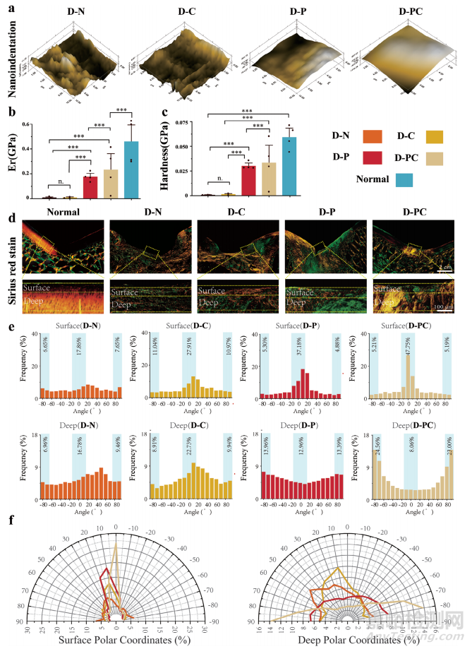 6個月后取樣,進行納米壓痕試驗,分析修復(fù)軟骨的表面平整度和力學(xué)性能。。D-PC組結(jié)果最佳,表面圓潤光滑,峰間間隙很小,與正常軟骨非常相似(圖5a)。隨后,將正常軟骨的彈性模量(Er)和硬度值與四個實驗組進行了比較。D-N 組和 D-C組的力學(xué)性能明顯較差,僅為正常軟骨的1-5%。D-P組的Er和硬度值顯著高于D-N組和DC組。然而,這些值顯著低于D-PC組(圖5b、c)。