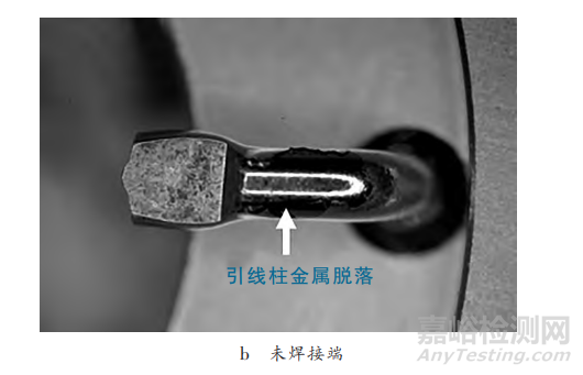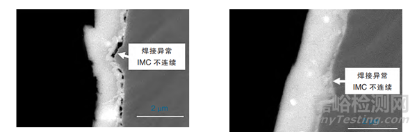 研究結(jié)果顯示,引線柱的金層和鎳層之間存在污染物,這些污染物導(dǎo)致金層與鎳層之間的結(jié)合力下降,最終導(dǎo)致金層脫落,鎳層裸露。在焊接過程中,由于污染物的阻隔,焊料無法與鎳層形成連續(xù)的金屬間化合物(IMC),導(dǎo)致引線柱潤(rùn)濕不良,焊接質(zhì)量下降。這種潤(rùn)濕不良的焊接質(zhì)量問題進(jìn)一步導(dǎo)致了產(chǎn)品輸出信號(hào)的階躍跳變,影響了產(chǎn)品的可靠性。
