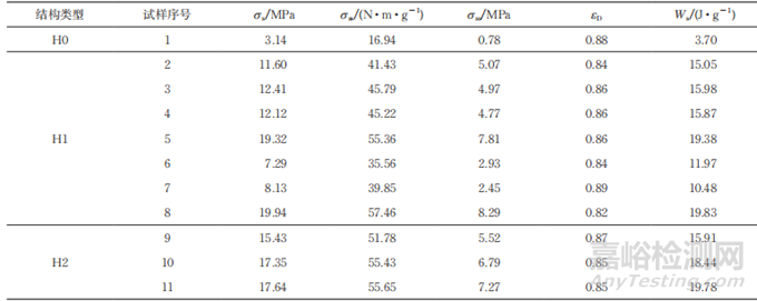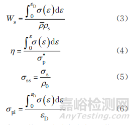 式中:ws為單位質量吸能;εD為致密應變,即能量吸 收效率最大時對應的應變;ε為應變;σ(ε)為應力;ρs為AlSi10Mg合金密度;η為能量吸收效率;σp*為0~ε應變內的最大應力;σss為比強度;σpl為平臺應力;σs為屈服強度。